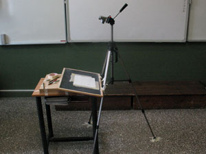 Στερεώνω τη φωτογραφική μου μηχανή στο πάνω μέρος του τρίποδα με την ειδική βίδα. Ρυθμίζω το τρίποδο, ώστε να κοιτάει προς τα κάτω, και τον τοποθετώ πάνω από το χαρτί μου. Παρατηρώ την οθόνη της φωτογραφικής μηχανής μου. Προσπαθώ να φαίνεται ίσιο και ολόκληρο το χαρτί με το σχέδιό μου στην οθόνη.